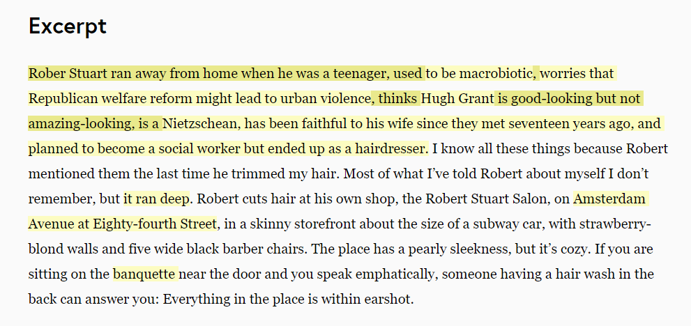 Robert Stuart ran away from home when he was a teenager, used to be macrobiotic, worries that Republican welfare reform might lead to urban violence, thinks Hugh Grant is good-looking but not amazing-looking, is a Nietzschean, has been faithful to his wife since they met seventeen years ago, and planned to become a social worker but ended up as a hairdresser. I know all these things because Robert mentioned them the last time he trimmed my hair. Most of what I’ve told Robert about myself I don’t remember, but it ran deep. Robert cuts hair at his own shop, the Robert Stuart Salon, on Amsterdam Avenue at Eighty-fourth Street, in a skinny storefront about the size of a subway car, with strawberry-blond walls and five wide black barber chairs. The place has a pearly sleekness, but it’s cozy. If you are sitting on the banquette near the door and you speak emphatically, someone having a hair wash in the back can answer you: Everything in the place is within earshot.